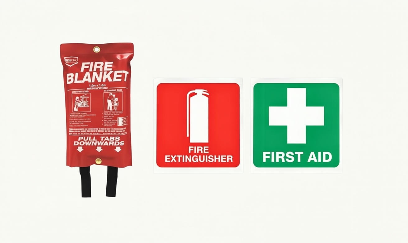 Fire blanket, first aid kit, safety stickers